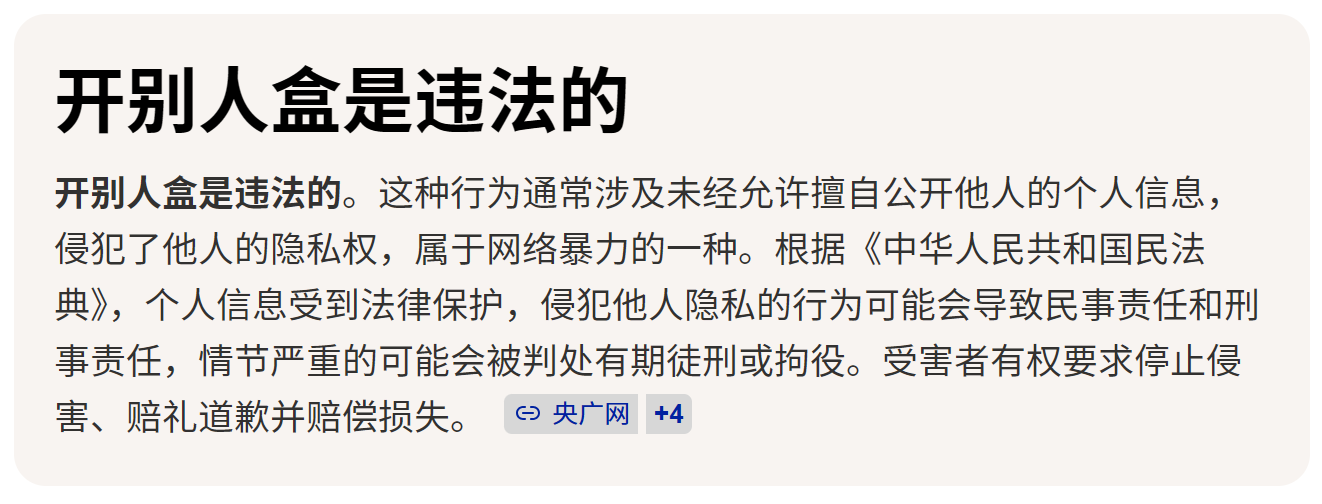 所以,无论站内站外,无论开盒谁,是管理还是别人,都是违规的,如果站内,第一次禁言,第二次封禁,如果站外,一次即可封禁。